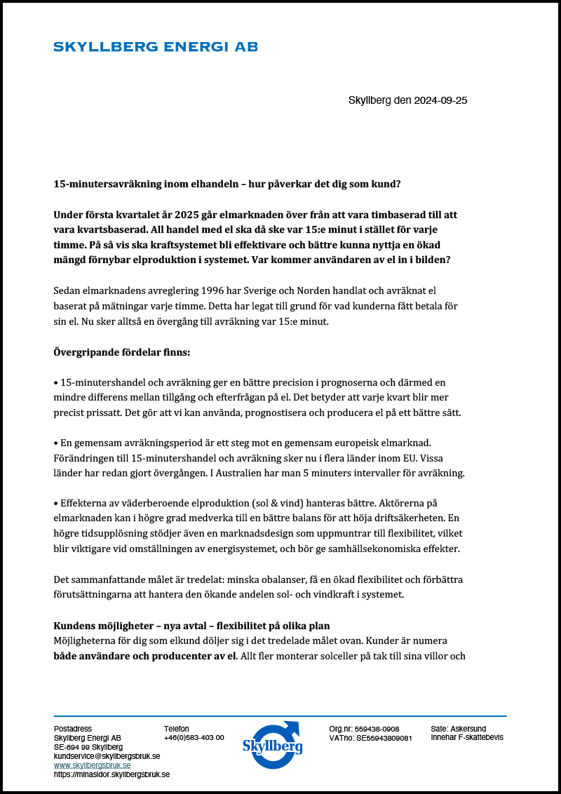 - Vilket el-område du bor i. Skyllbergs Bruks elnät ligger i el-område 3, men Skyllberg Energi AB har även elhandelskunder utanför det egna elnätet.