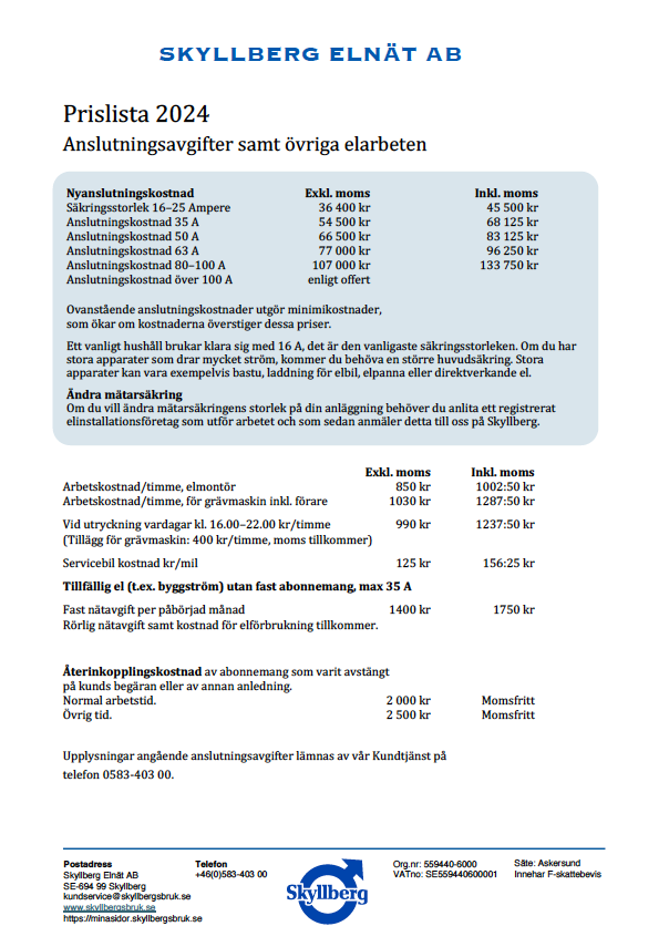 Om du har synpunkter på din elräkning eller på hur vi sköter dina elfrågor ber vi dig kontakta Karin Skålberg, Thomas Pehrson eller Maria Gunnarsson, vd för Skyllberg Elnät AB. Telefon till Skyllbergs Bruks växel: 0583-403 00